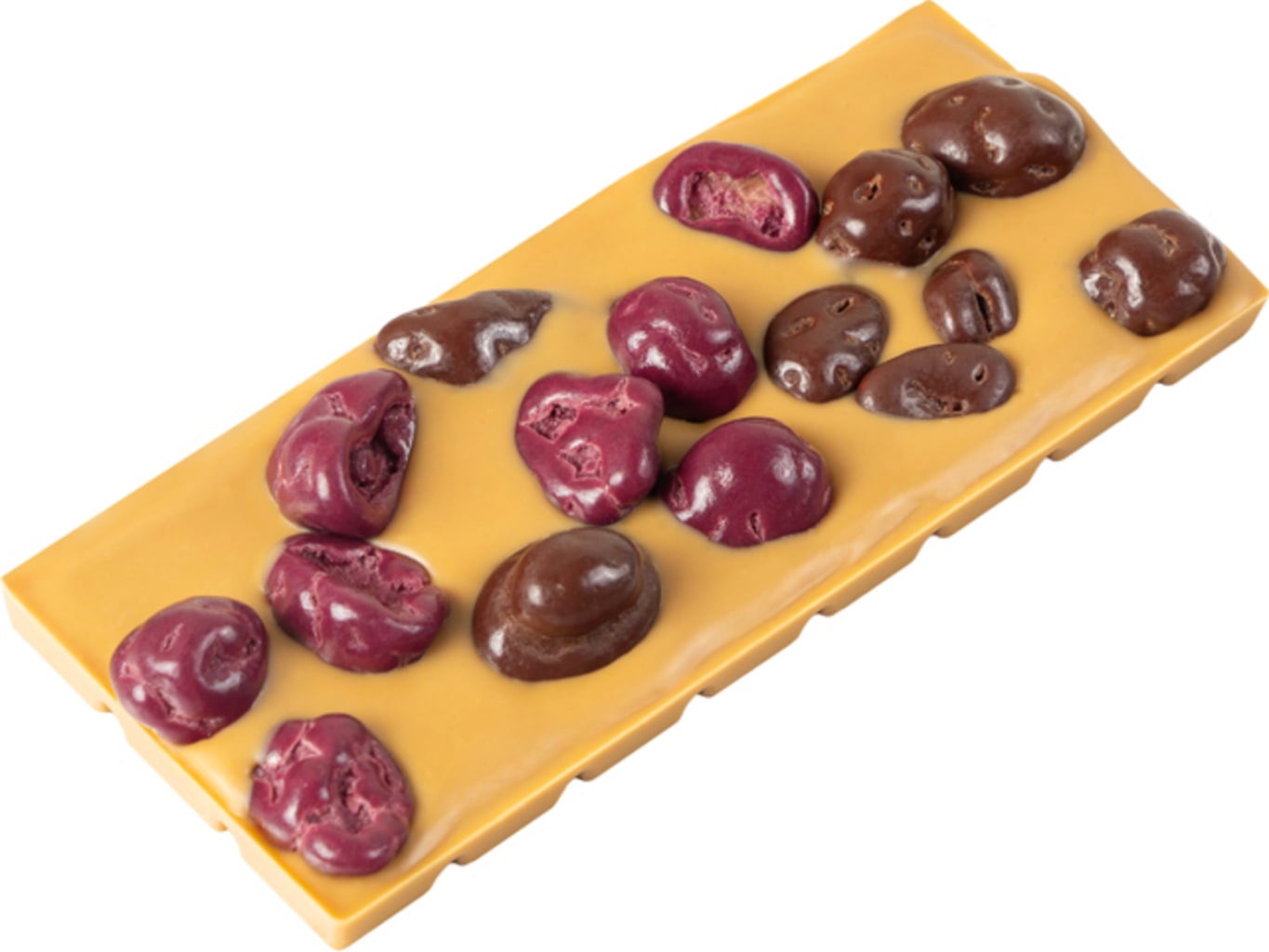 Prawdziwa radość kryje się jednak w dodatkach: oblane czekoladą dzikie migdały górskie. Te pochodzące ze sprawiedliwego handlu, delikatnie prażone migdały z dzikich zbiorów zostały skarmelizowane i oblane mleczną czekoladą. Obok nich znajdują się oblane czekoladą orzechy makadamia w zaskakującej purpurowej polewie z czarnej porzeczki. Ten piękny, jasny kolor pochodzi naturalnie z prawdziwych czarnych porzeczek i nadaje kreacji owocowy charakter.