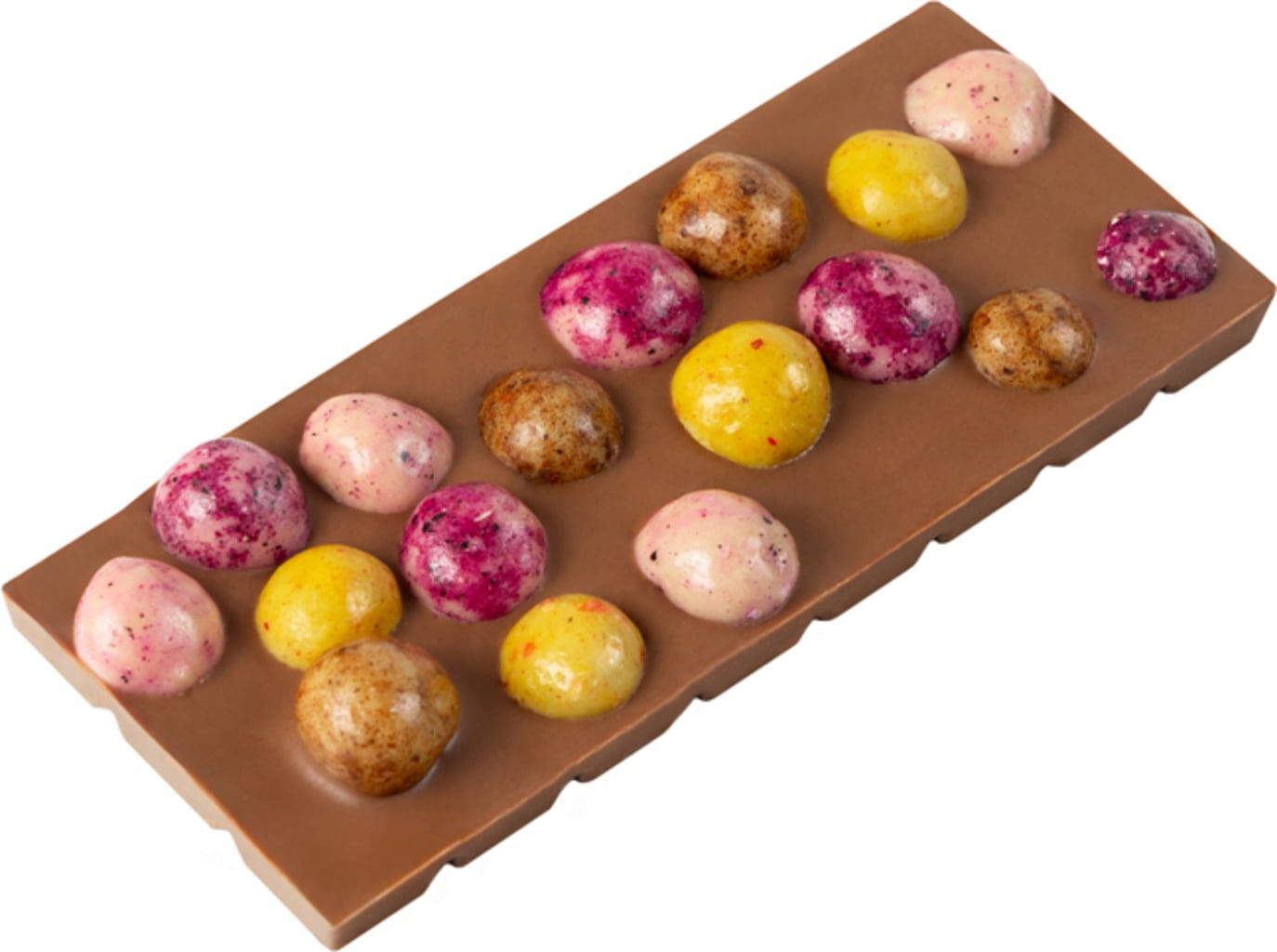 Na tej bazie prezentuje się konfetti z kolorowych ,czekoladowych orzechów laskowych w aż trzech rodzajach i kolorach. W środku znajdziesz prażone orzechy laskowe, które zachwycają swoją chrupkością. Pierwszy rodzaj jest w białej czekoladzie o fantastycznym smaku cynamonu. Drugi zaskoczy Cię fioletową polewą z owocu smoczego (Dragon Fruit). A trzeci wariant lśni w jaskrawej, kurkumowo-żółtej barwie, ozdobiony owocowymi truskawkowymi drobinkami. Kolorowe i urozmaicone doznanie chrupkości!