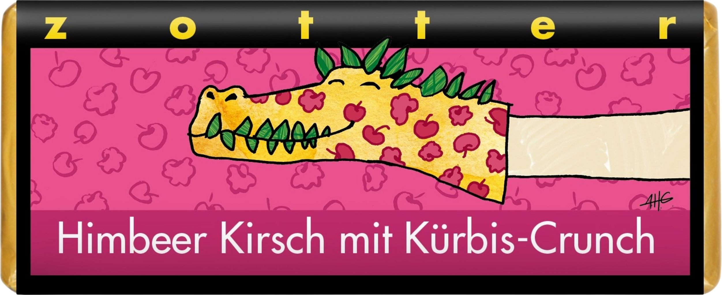 Pierwsza warstwa to ciemnoczerwone, owocowe doznanie: marcepan malinowy i wiśniowy. Smakuje klasycznie i przypomina pyszny deser od babci. Innowacyjna, lekko ziemista nuta jest dodana jako typowy składnik Zotter: zielona warstwa nugatu z pestek dyni, która nadaje całości styryjskiego charakteru. Chrupkość zapewnia kruchy wafel, który doprawia warstwę nugatu.